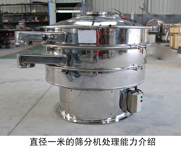直徑一米的篩分機功率為0.75kw,篩分直徑為920m/m,入粒粒度小于10mm,電壓為380V,轉(zhuǎn)速達到1440r/min,以物料為大砂的干式篩分條件下,可處理800kg/h,篩分產(chǎn)量相對較大,屬于旋振篩里的中型設備。